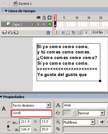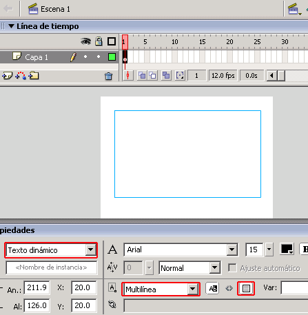 Comenzamos introduciendo un campo de texto dinámico el cual tenga en el tipo de línea seleccionada la opción de multilínea, además tendremos que seleccionar la opción de mostrar borde alrededor del texto, esta ultima opción es solamente una sugerencia. El tipo de fuente y tamaño son también al gusto del cliente.