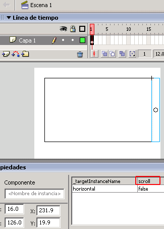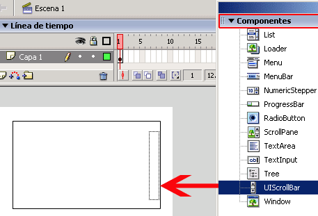 El ejemplo de scroll que a continuación mostramos, es solamente uno de los componentes integrados en e Flash MX 2004. El componente Scroll tiene solo una desventaja, las partes que lo integran (flechas y barra) son dificiles de editar para la mayoría de los usuarios. Sin embargo en comparación con el Flash MX, el Flash MX 2004 no introduce símbolos adicionales a la biblioteca.