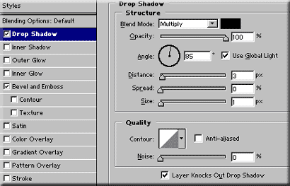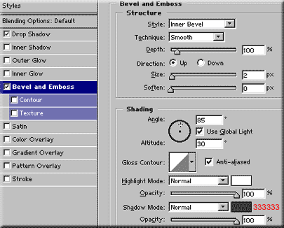 | Como primer toque 3D vamos a usar los estilos de capa: Drop Shadow y Bevel and Emboss (Sombra Paralela y Bisel y Relieve). Debajo tienes los valores usados, pero eres totalmente libre de ajustarlos a tu parecer, sólo recuerda que deben de ser muy tenues. |