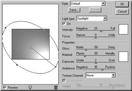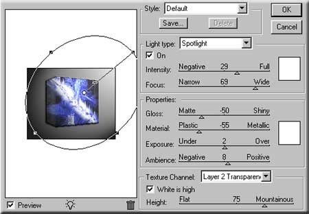 | Continuamos con la luz frontal, la razón de ser de la sombra principal. Toma la capa del fondo y sobre ella aplica la iluminación. Filter > Render > Lighting Effects Filtro > Interpretar > Efectos de Iluminación Usa los Valores de la imagen derecha. |