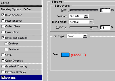 Layer > Layer Styles > Drop Shadow, Bevel And Emboss y Stroke